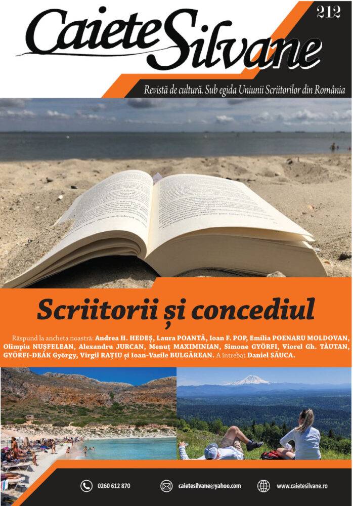 Ancheta „Caiete Silvane”: Scriitorii și concediul. Răspund: Andrea H. Hedeș, Laura Poantă, Ioan F. Pop, Emilia Poenaru Moldovan, Olimpiu Nușfelean, Alexandru Jurcan, Menuț Maximinian, Simone Györfi, Viorel Gh. Tăutan, Györfi-Deák György, Virgil Rațiu, Ioan-Vasile Bulgărean. A întrebat Daniel Săuca 29