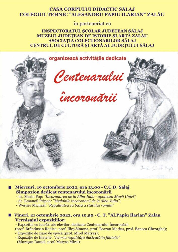 Astfel, miercuri 19 octombrie 2022, la ora 13.00, în sala de ședințe a Inspectoratului Școlar Județean Sălaj va avea loc Simpozionul dedicat Centenarului Încoronării. Prezintă: