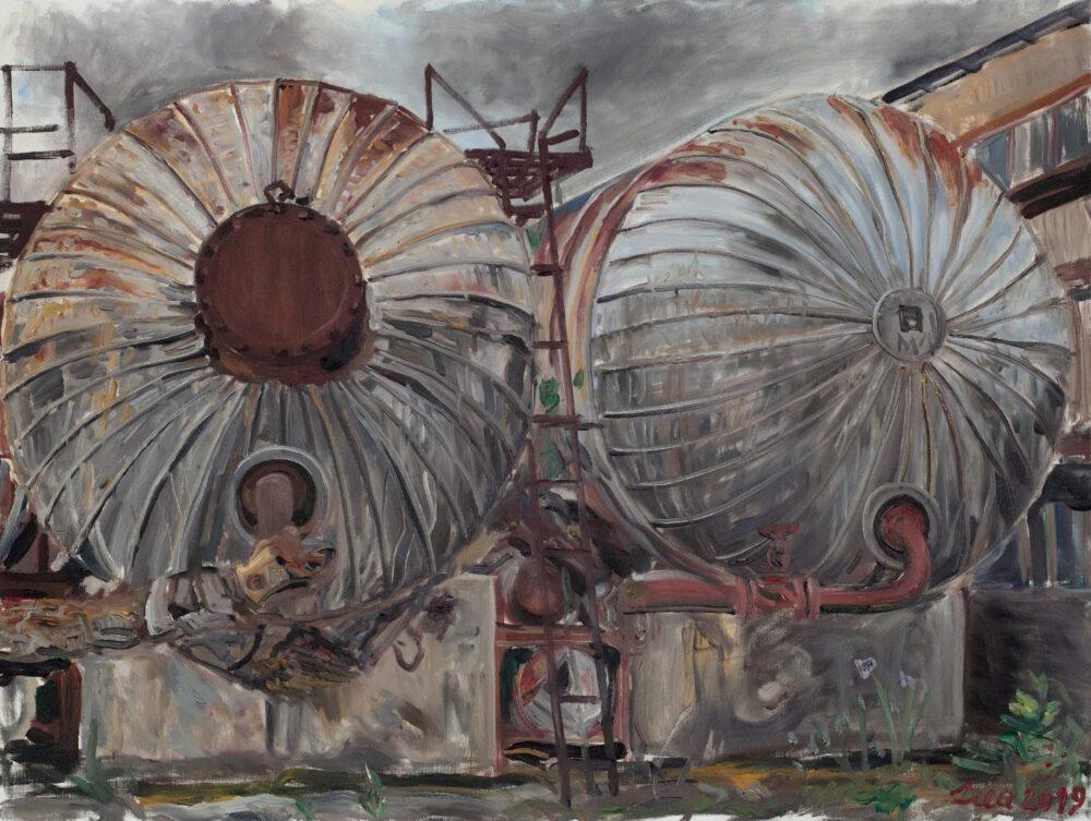 Între timp, natura, încet dar sigur își recucerește teritoriul la CET Zalău. Plopi cresc peste tot, la fel și iarba, buruieni și tufe de ciulini. În toamna trecută, am cules mure de acolo. Mi-a plăcut să pictez la CET Zalău, deoarece e liniște. Am pictat, absorbit fiind de acele imagini care parcă și acum îmi rămân bine întipărite în minte: rezervoare mari ruginite, o întreagă țesătură de țevi, stâlpi solizi din beton, tavane sparte prin care se poate vedea cerul, dar și vegetația care apare peste tot, inclusiv ciori și tot felul de alte păsări. Într-o sală mare dezafectată, unde încă mai este un bazin cu apă, am făcut o expoziție, pentru mine și pentru porumbeii care locuiau acolo. Am schimbat expoziția de două-trei ori, la fiecare trei luni, întrucât a fost mult mai practic pentru mine să-mi usuc picturile acolo, în loc să le aduc acasă. Erau și turnurile, da, se vedeau de departe. Ce se va întâmpla cu ele? Vor fi distruse? Sau nu?” (Gheorghe Ilea).