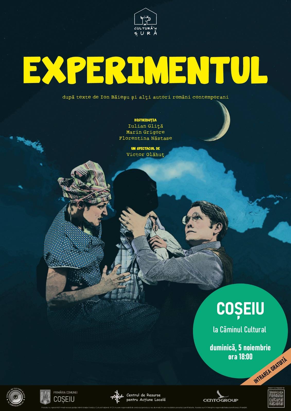„Experimentul” este parte a ofertei teatrale propusă de Cultură’n Șură în această stagiune în cadrul proiectului „10 la sat” co-finanțat de Administrația Fondului Cultural Național (AFCN) și Centrul de Cultură și Artă al Județului Sălaj. Parteneri în proiect sunt Școala Gimnazială „Vasile Lucăcel” Someș-Odorhei, Primăria Comunei Năpradea, Primăria Comunei Bănișor, Primăria Comunei Coșeiu, Centrul de Cultură și Artă al Județului Sălaj.