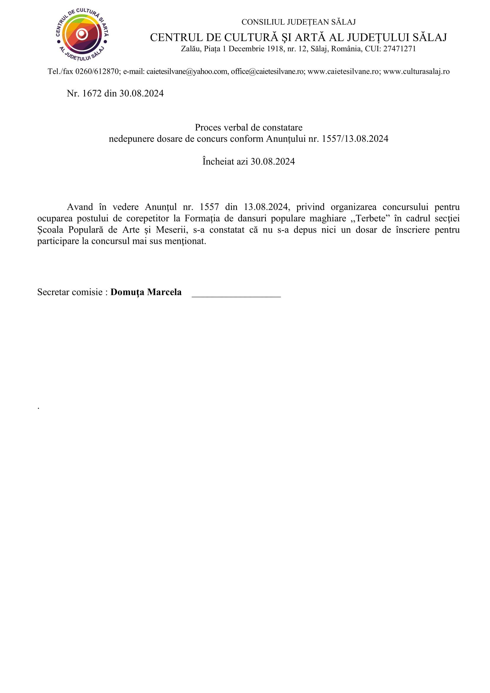 Proces verbal de constatare nedepunere dosare de concurs pentru ocuparea postului de corepetitor
