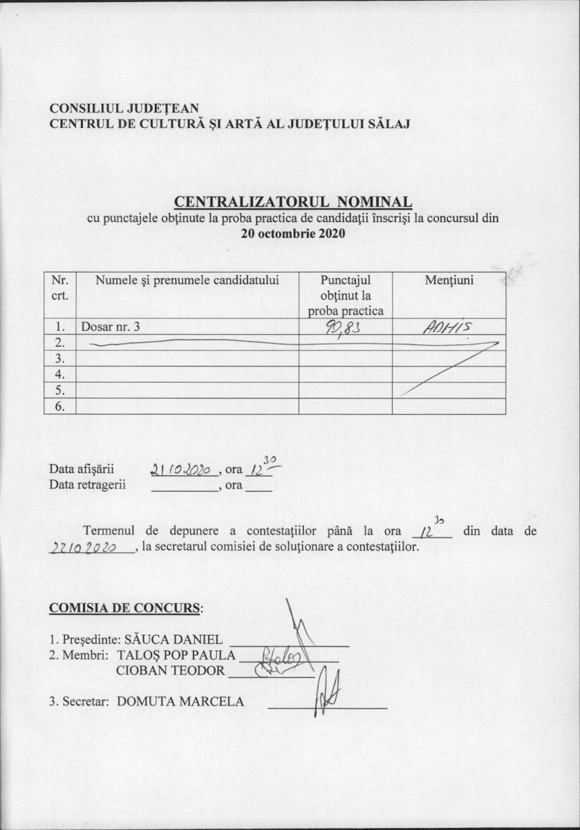 Rezultatul final al concursului pentru ocuparea postului de referent marketing cultural
