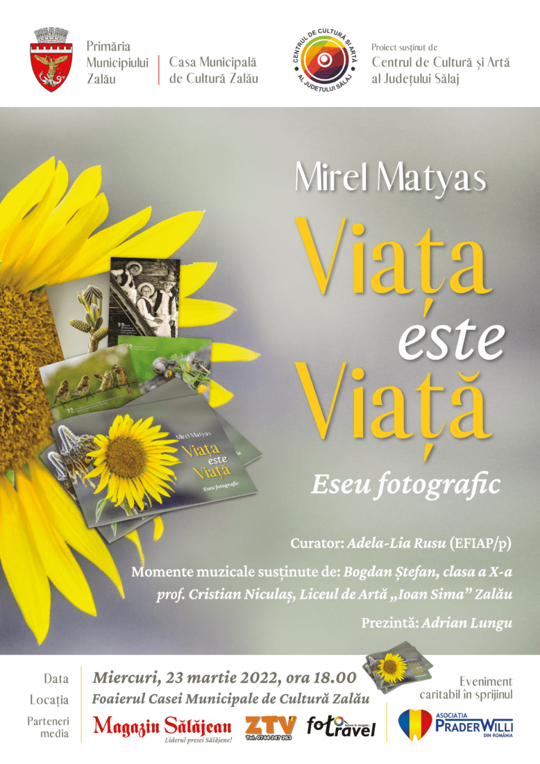 Vernisajul expoziției „Viața este Viață. Eseu fotografic” va avea loc, miercuri, 23 martie 2022, la ora 18:00, în foaierul Casei Municipale de Cultură. Momentele muzicale vor fi susținute de elevul Bogdan Ștefan din clasa a X-a de la Liceul de Artă „Ioan Sima” Zalău, coordonat de domnul profesor Cristian Niculaș, iar prezentarea va fi realizată de jurnalistul Adrian Lungu. Evenimentul este susținut de Centrul de Cultură și Artă al Județului Sălaj. Parteneri media: Magazin Sălăjean, ZTV și blogul Foto-Travel.