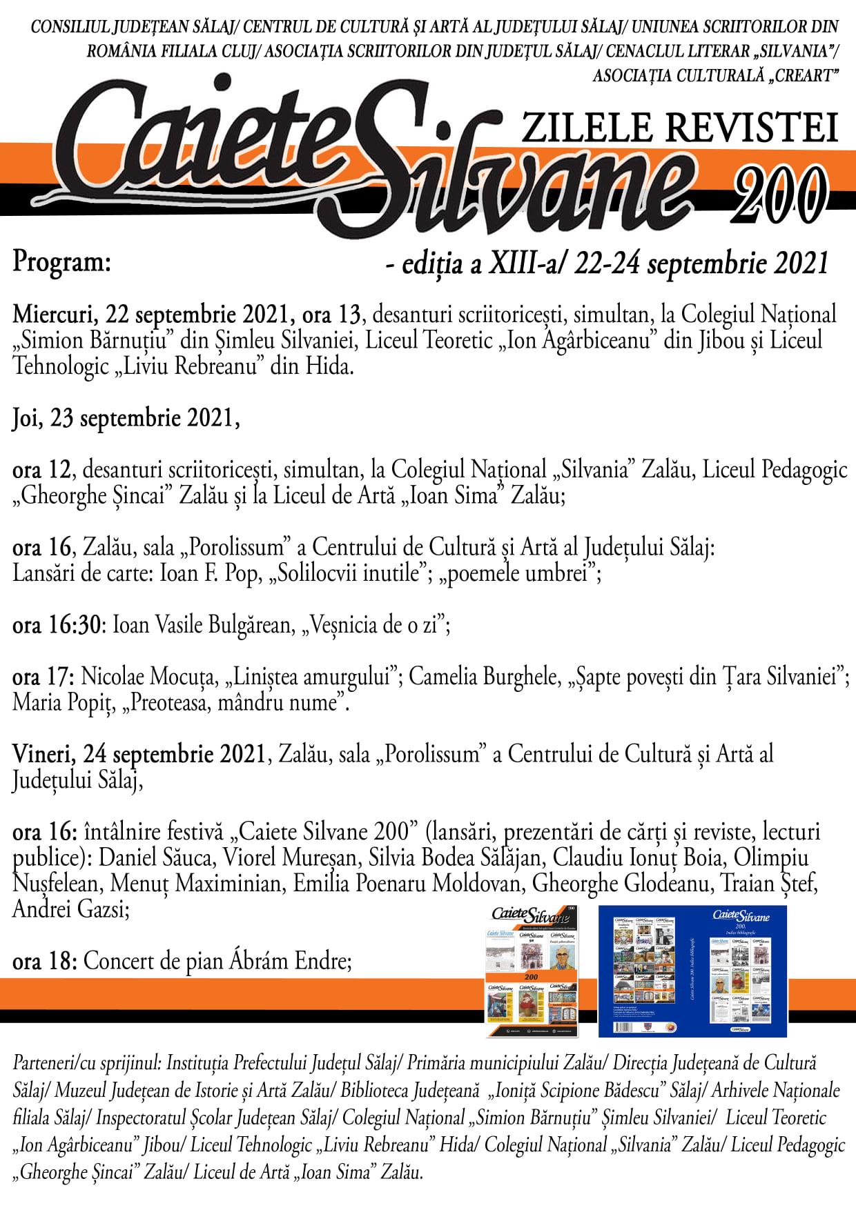 de la ora 16, întâlnire festivă „Caiete Silvane 200” (lansări, prezentări de cărți și reviste, lecturi publice): Daniel Săuca, Viorel Mureșan, Silvia Bodea Sălăjan, Claudiu Ionuț Boia, Olimpiu Nușfelean, Menuț Maximinian, Emilia Poenaru Moldovan, Gheorghe Glodeanu, Traian Ștef, Andrei Gazsi